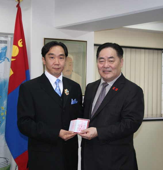 モンゴル国の伝統芸術を、長年において演奏活動を通して幅広く紹介し普及してきたこと、モンゴルの民族楽器リンベを改良し発展させ、音楽専門教育機関におけるリンベのカリキュラムの発展に貢献したこと、また芸術を通して日本とモンゴルの友好親善にも多大な貢献をした功績が認めら受章となりました。