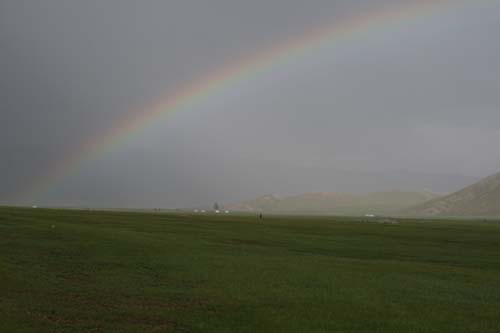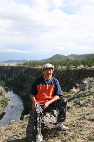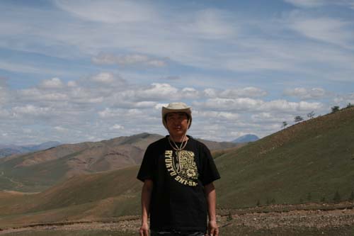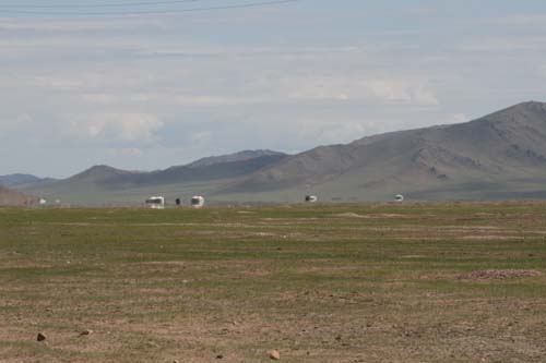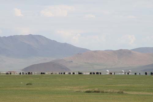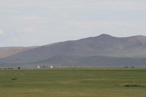 日本の富士山のような高い山が遠くに青く見えます。 モンゴルの人々が尊敬する山です。 | その山です。モンゴルの西部にあります。 この辺りは標高が高く夏でも万年雪があります。 |