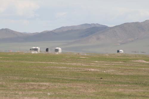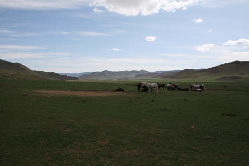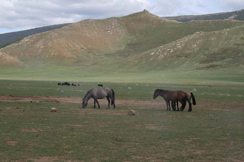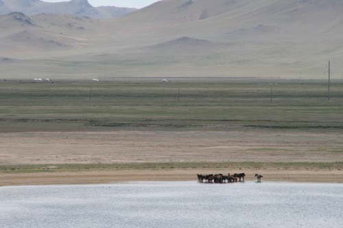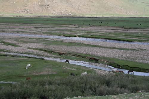 | 遊牧民の馬。夏なので馬の乳からアイラグを作ります。 | 標高の高い所でも遊牧民が動物たちと 生活しています。 |