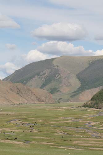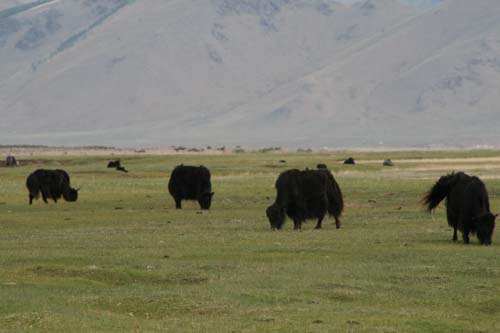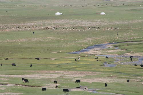 | サルラグ(モンゴルの牛)がたくさん遊牧されていました。 | 黒い毛の長い牛がサルラグ、後方には羊や山羊の群れ。 |