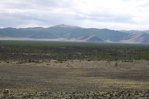 | テルヒー・ツァガーン湖。とても大きな湖です。 | 湖の近くに大きな火山があり、その火山灰です。 |