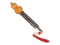 中国雲南省の少数民族に伝わる、ひょうたんと竹を使って作られたたて笛です。真ん中に太い管、両側には単音竹という2本の管があります。吹き口にはリードがついていて、独特のやわらかい響きのする多重音楽器です。 |