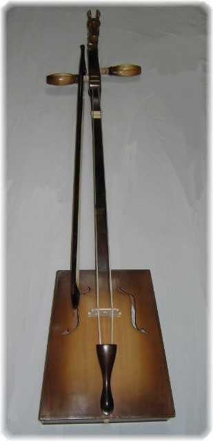 その名の通り、馬の頭の部分の彫刻がついた弓で弾く弦楽器。また、弦、弓とも全て馬のしっぽの毛でできています。かつては音の鳴る共鳴箱の部分は馬の頭の骨で作られていました。その後、木と羊の皮で作られるようになり、最終的に現在のような木の共鳴箱になりました。バイオリンとチェロの中間の音域を持っています。 モンゴル語ではモリンホールと呼びます。 |