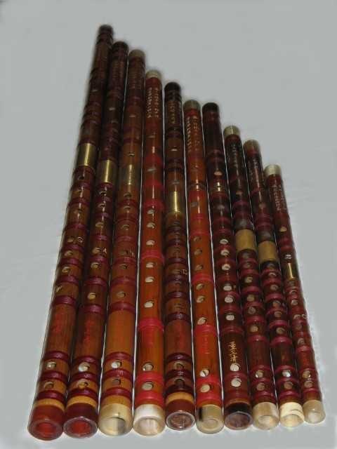 中国の民族楽器の竹でできた横笛で、リンベや他の国の笛と違う特徴として、吹き穴と指の穴の間に薄い笛膜のついた穴があります。膜は薄い葦を張り付けたもので、吹いた時にこの膜が空気で振動し、独特の張りのある音色を生み出します。 |
