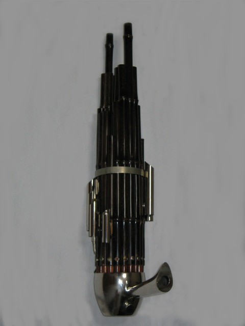 ペルーの民族楽器ですが、これは中国で作られている竹製のものです。一管一管で音が違います。上から息を吹き込んで音を出します。 |